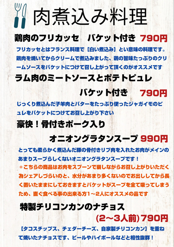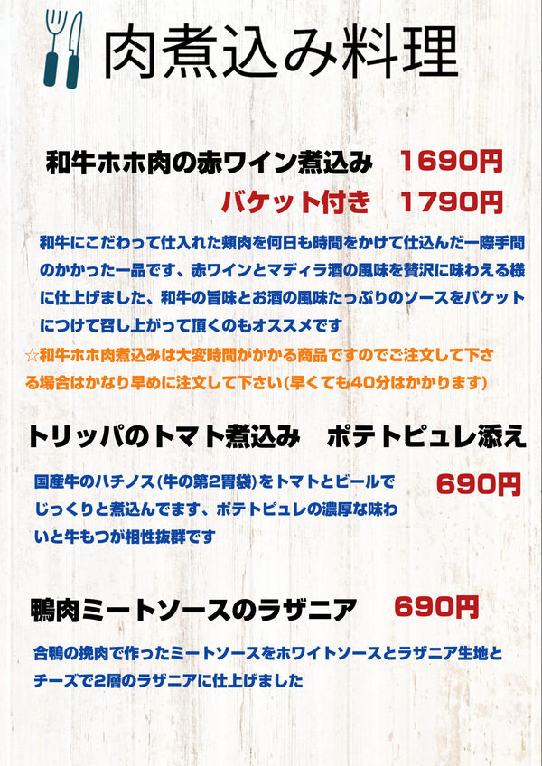当店は自家製にこだわりソースやドレッシングは勿論、肉煮込み料理などじっくりと時間をかけて丁寧に作りお客様に提供する事を心掛けています。